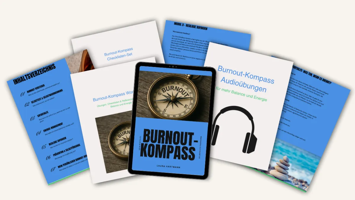 Der Burnout-Kompass ist ein Komplettpaket (E-Book + Workbook + Audioübungen), das dich in nur wenigen Wochen von Dauerstress und Erschöpfung hin zu mehr Energie, Klarheit und innerer Ruhe bringt.